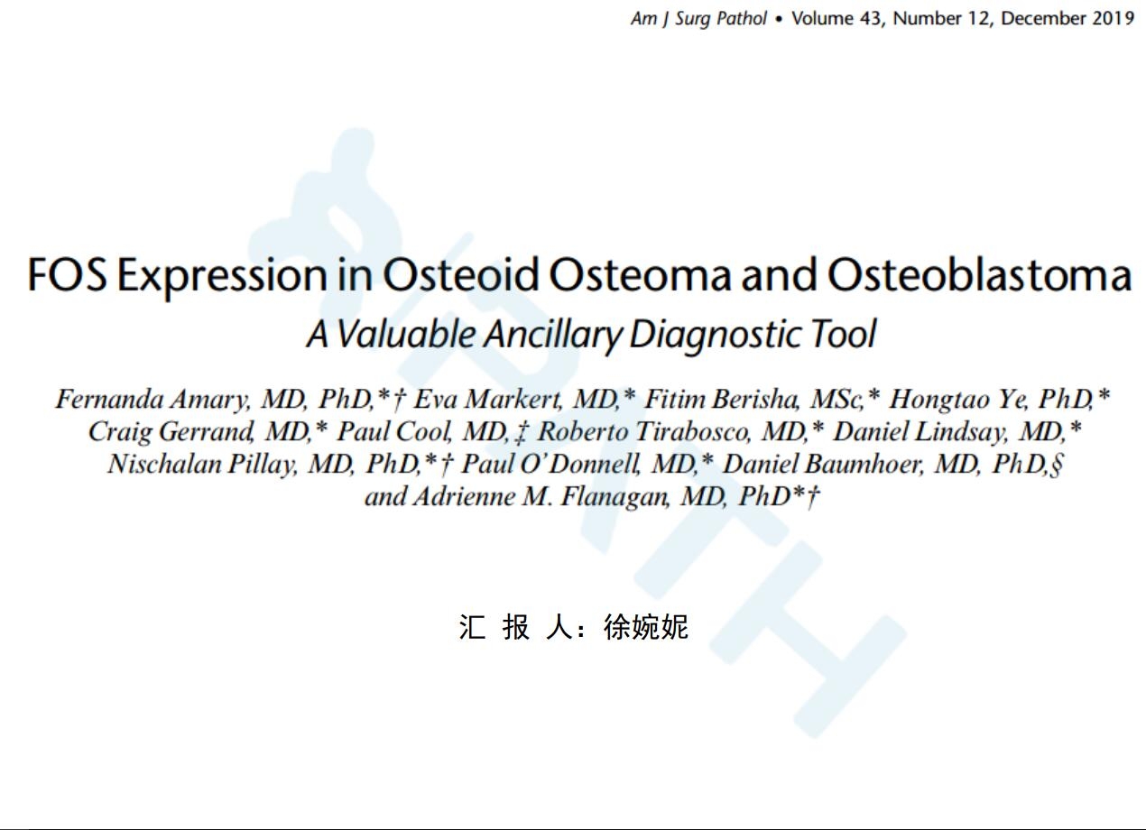 FOS在骨样骨瘤和骨母细胞瘤中表达,可作为一个有价值的辅助性诊断工具