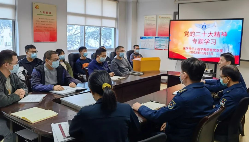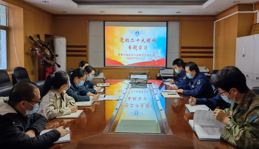 高举伟大旗帜,凝聚奋进力量。军事生物医学工程学系党委围绕学习党的二十大精神,强化组织领导、创新方式方法、突出转化运用,通过领读串讲、集体研读、个人自学和讨论交流等方式,开展多种形式的促学活动,进一步统一思想、凝聚共识,掀起学习贯彻党的二十大精神热潮。