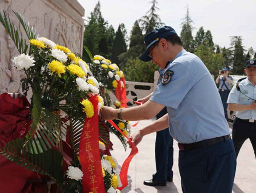 在庄严肃穆的“扶眉战役烈士纪念碑”前,全体人员庄严肃立,军事医学心理学系主任、军事生物医学工程学系协理员代表全体人员向纪念碑敬献花篮。