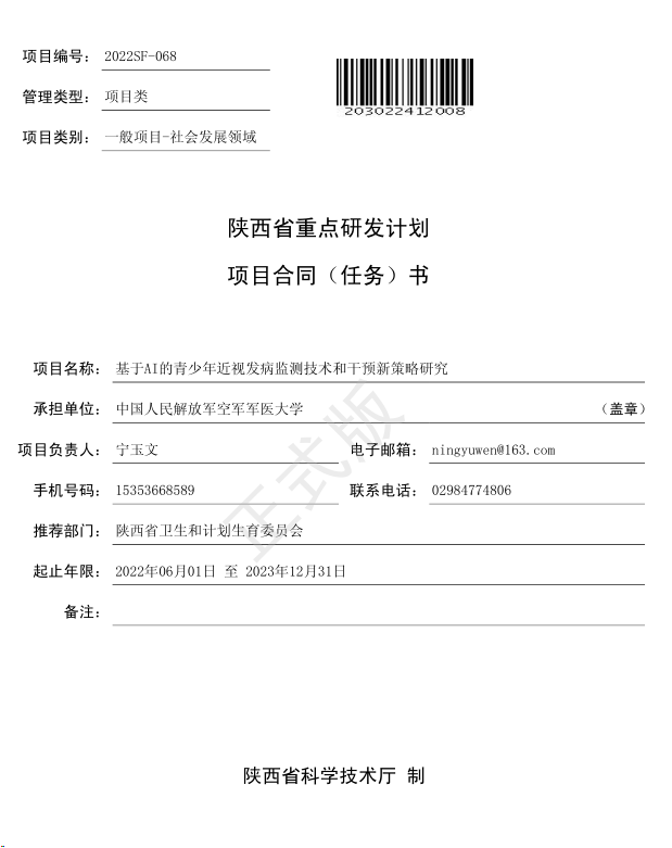 宁玉文副教授申请的《基于AI的青少年近视发病监测技术和干预新策略研究》获批重点研发计划。项目主要围绕青少年视力监测需求,针对行业普遍缺乏视力智能化监测工具的痛点问题,在青少年视力监测抽样数据和西京医院眼科近五年青少年近视病例的基础上,主要开展三个方面的研究:(1)青少年近视发生危害因素调查研究。抽样调查青少年群体视力健康监测数据,结合青少年近视的电子病例,分析青少年近视发生发展规律,建立近视发病本底数据库,构建青少年近视危害因素模型。(2)青少年近视监测技术与工具。应用AI技术试验青少年近视早期干预适宜技术,研发个体可穿戴自助视力检测器,研发一套视力监测与分析平台,实现数据自动统计、分析、汇总,并设计多组织端口输出视力健康报告。(3)青少年视力健康干预与防治方案。研究利用AI技术可明显提高近视防治效果的新技术和防治方案,开发青少年视力健康干预助手系统,形成视力预警监控机制,实现智能预警。目标是构建基于AI技术支撑的近视发病监测和分析平台,实验形成1-2项近视防治新技术,建立适宜青少年近视综合防治的精准实施方案,为提高青少年近视类疾病的早发现与早干预提供智能化服务。