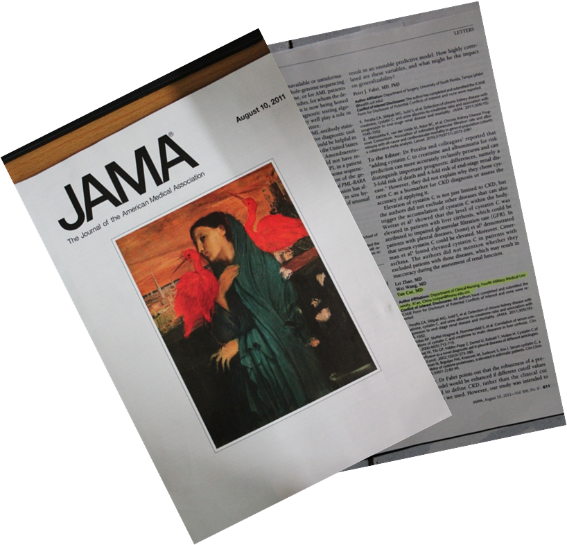 我院临床护理教研室崔艳主任经过一年多的刻苦钻研,于去年在《The journal of applied physiology 》杂志发表SCI论文1篇,名为《Modulation of intracellular calcium transient in response to β-adrenoceptor stimulation in the hearts of 4-wk-old rats during simulated weightlessness》,该杂志影响因子为3.833。近期捷报再传,崔主任在《The journal of the American Medical Association(JAMA)》2011年306卷6期又发表一篇letter《Biomarkers for Detecting and Risk-Stratifying Chronic Kidney Disease》,影响因子30.011,此文就Cystatin与慢性肾病的非特异性关系这一问题与作者进行了探讨。