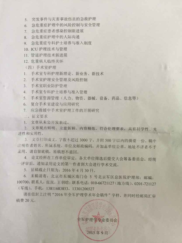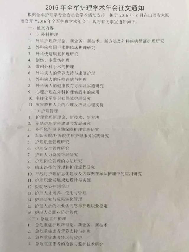 2016年全军护理学术年会征文通知