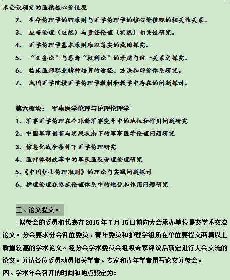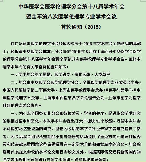 2015中华医学会医学伦理学分会第十八届学术年会首轮通知