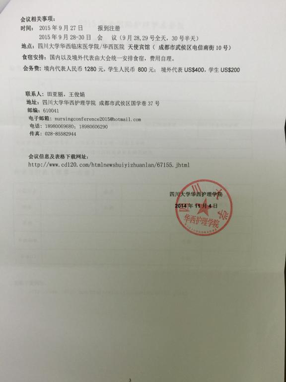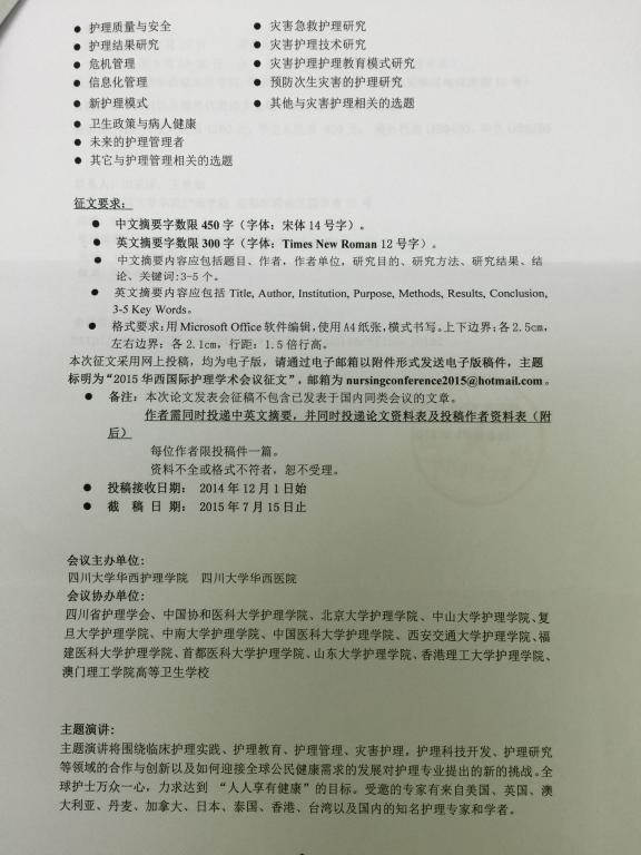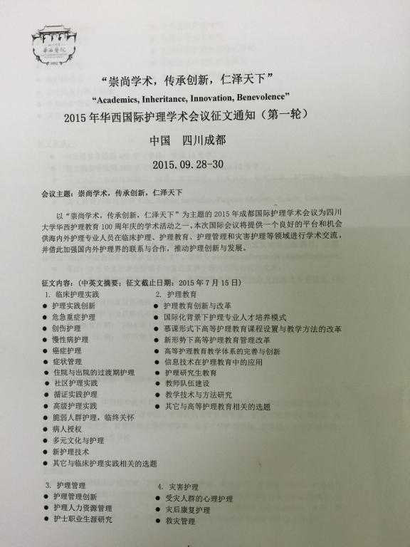 “崇尚学术,传承创新,仁泽天下”2015年华西国际护理学术征文通知