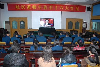 11月8日上午9时,航医系组织师生集中收看万众瞩目的中国共产党第十八次全国代表大会开幕式,认真聆听了胡锦涛总书记的报告。收看现场,大家一边专心听取胡锦涛总书记《坚定不移沿着中国特色社会主义道路前进为全面建成小康社会而奋斗》的工作报告,一边认真做笔记。大家一致认为,胡总书记的工作报告内涵丰富、思想深刻,高屋建瓴、振奋人心,为促进社会和谐,全面建设小康社会,开创中国特色社会主义事业新局面指明了方向。纷纷表示要以更加饱满的热情、更加昂扬的斗志、更加扎实的态度,全身心投入祖国的航医教育科研事业,履行好人民军队的神圣使命,为国防现代化建设做出新的更大的贡献。