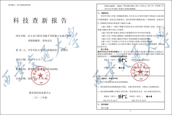 该机器人在手术中精准实施了上颌骨LeFort I型截骨(正颌外科手术的一种截骨术式,需将上颌骨从面中部截断),并将上、下颌游离骨块准确移动、固定至术前规划的理想位置。经科技查新,这是国际范围内机器人首次自主完成正颌手术中的截骨与骨块定位任务,标志着我国自主式口腔手术机器人技术已具备处理口腔颌面外科最复杂、精度要求最高手术类型的能力。