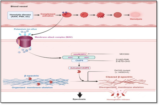 此项研究证实ABO血型抗原抗体反应活化补体后,既形成攻膜复合物在红细胞膜上打孔,又转导胞内NLRP3-ASC-Caspase-8-Spectrin-β信号,调控溶血中红细胞的程序性死亡,从而完善修正了百年来的补体溶血理论,为预防、诊治溶血打开了新视野。Jules Bordet因发现补体而获得1919年诺贝尔奖,Karl Landsteiner因发现人类ABO血型而获得1934年诺贝尔奖。基于此的经典溶血理论是ABO血型抗原抗体反应激活补体,在红细胞膜上打孔造成溶血。人体内有大量红细胞,补体介导的溶血严重威胁患者生命和输血安全。以补体C3或C5为靶标的药物已用于临床,然而补体抑制治疗并不总是有效。研究团队以ABO血型反应活化补体的经典理论为起点,探索了溶血的胞内机制:证实溶血过程中红细胞经历了程序性死亡,胞内NLRP3-ASC-Caspase-8-Spectrin-β信号轴控制红细胞膜骨架稳定,抑制NLRP3和Caspase-8可高缓解溶血,联合干预NLRP3-Caspase-8和抑制补体能更有效减轻溶血。