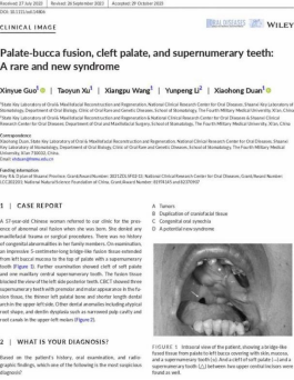 近期,大学口腔医院段小红教授课题组在《Oral diseases》杂志发表了题为“Palate-bucca fusion, cleft palate and supernumerary teeth:A rare and new syndrome”的研究论文,通讯作者为段小红教授,第一作者为硕士研究生郭新月,其他作者为许涛云、王祥璞和李云鹏。文章首次提出并命名一种新的口腔罕见病:腭颊融合-腭裂-多生牙综合征。