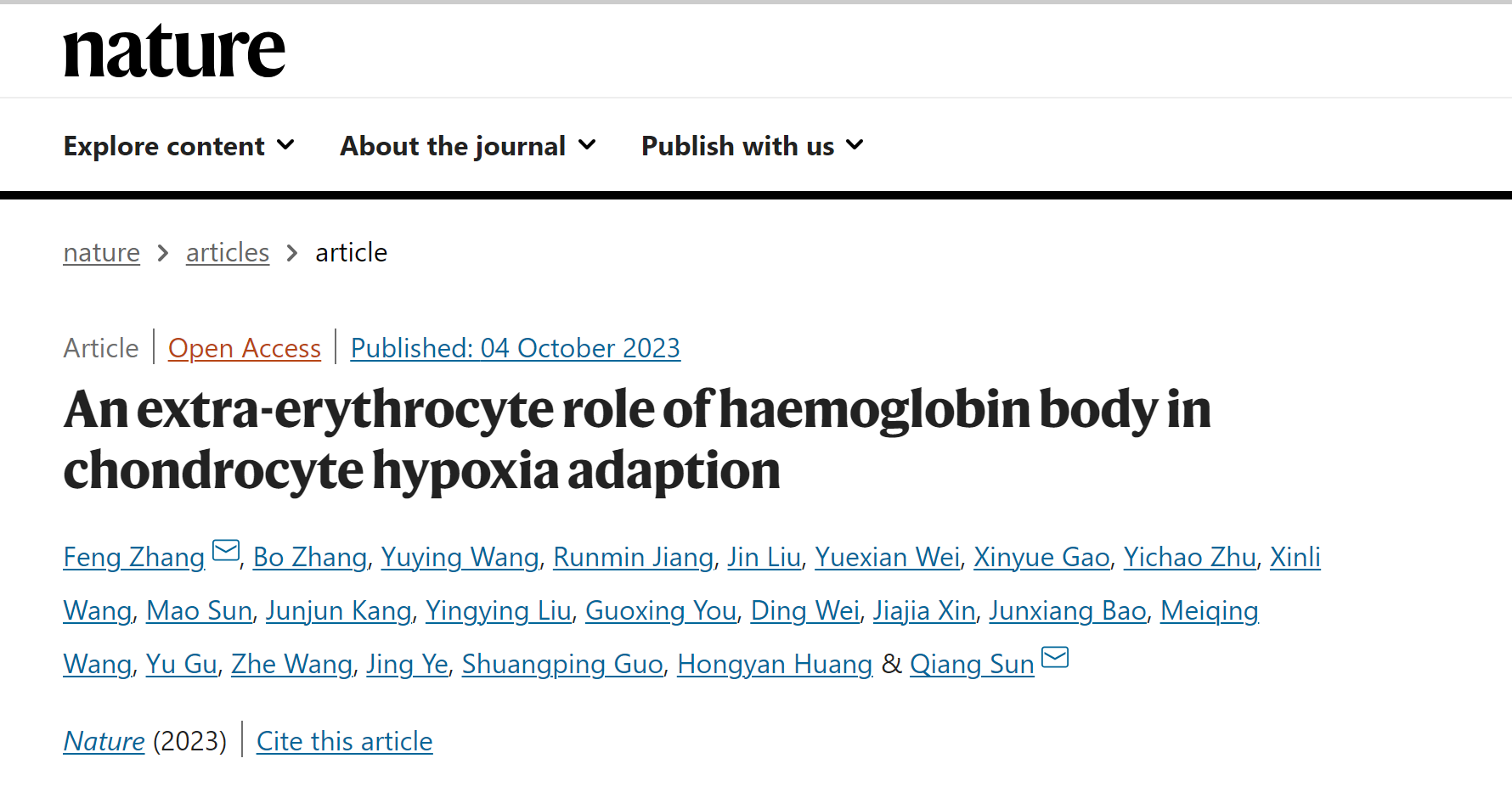 10月4日晚11时,空军军医大学基础医学院张丰副教授以第一作者、第一通讯作者在国际顶级学术期刊《自然》(Nature)杂志在线发表了关于血红蛋白体在软骨细胞耐受缺氧机制方面的创新研究成果,标志着大学基础医学研究实现新的重大突破。研究论文题目为“An extra- erythrocyte role of haemoglobin body in chondrocyte hypoxia adaption”,军事医学研究院张波博士为共同第一作者、孙强研究员为共同通讯作者。