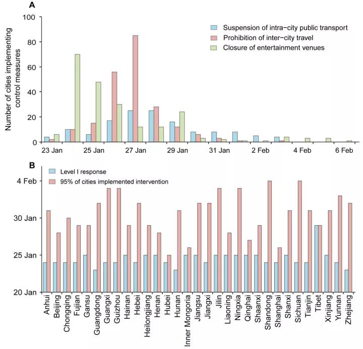 图A提示的是每天采取上述三条防控措施的城市数量,图B则是按照不同省份划分,省内95%城市做到上述三条防控措施的时间点