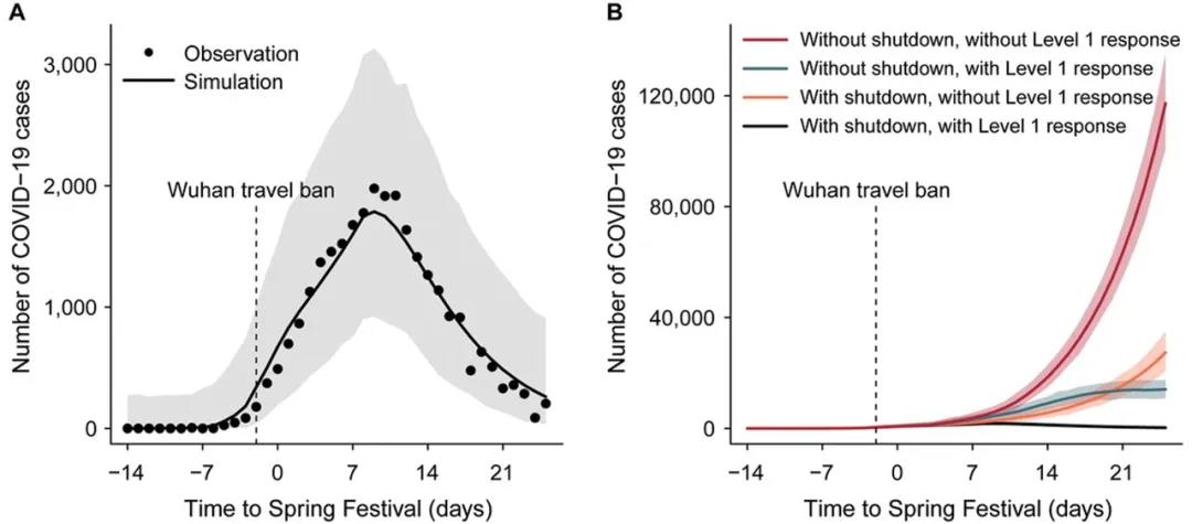 研究团队也根据分析模型,估算了几种可能的状况:假如武汉不封城、各地不防控,那么到2月19日,武汉之外确诊病例会是74.4万例;只封武汉的话,这个数字会降到20.2万例;只有双管齐下,才能降到各地只有约3万例的实际结果。
