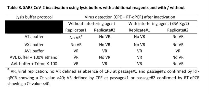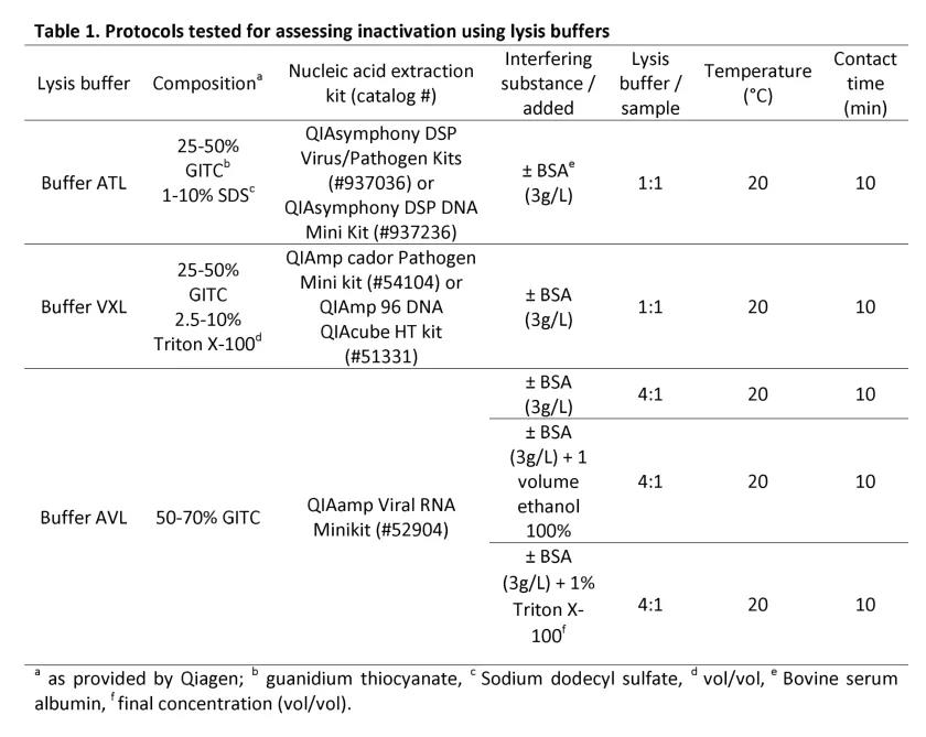 以前的研究已经解决了核酸提取的初始步骤中添加到样品中的裂解缓冲液作为几种病原性病毒(包括冠状病毒)的灭活剂的能力。但是,使用不同方法观察到的结果不一致,导致结论有争议。