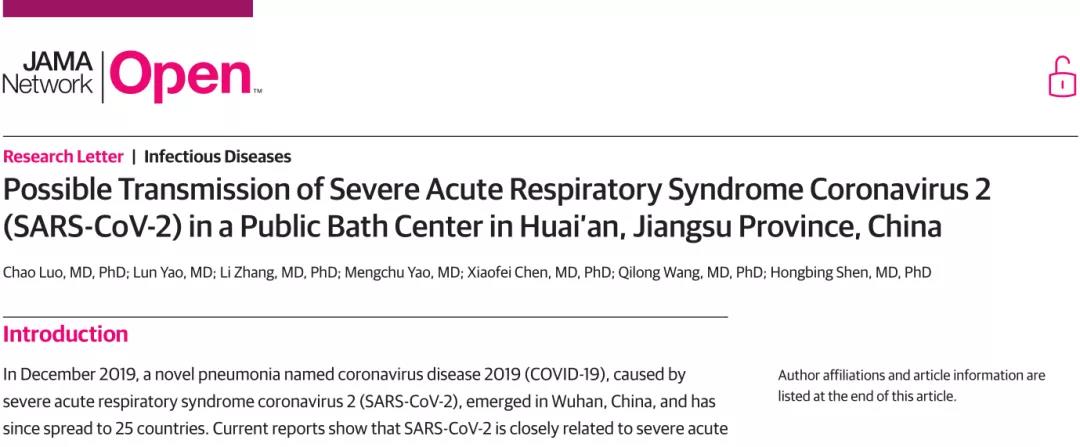 但是,3月30日,一项来自中国研究团队的,在线发表在的JAMA Network Open上,题为Possible Transmission of Severe Acute Respiratory Syndrome Coronavirus 2 (SARS-CoV-2) in a Public Bath Center in Huai’an, Jiangsu Province, China的研究中2,研究人员在剖析1月中下旬发生在江苏淮安的一个公共浴场,1位有武汉接触史的新冠患者在高温高湿环境下传染了8人的传播案例后发现:新冠病毒可在高温高湿的环境下存活并传播,且可传播性并不会减弱。