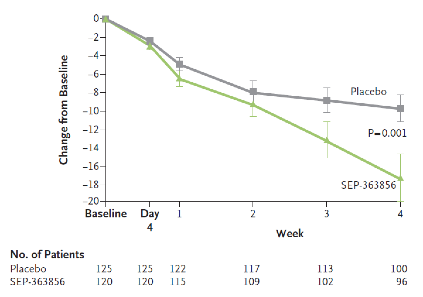 共有295名患者接受了筛查,其中245人被随机分入SEP-363856组(n=120)或安慰剂组(n=125),并接受了至少一次治疗及基线后疗效评估。