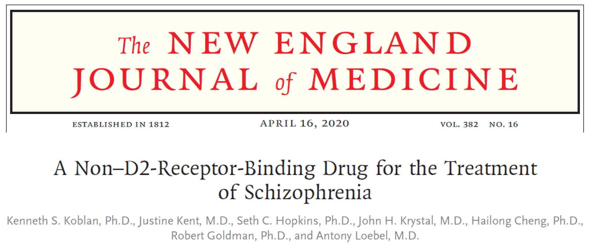 1. Koblan KS, Kent J, Hopkins, SC, et al. A Non–D2-Receptor-Binding Drug for the Treatment of Schizophrenia. N Engl J Med 2020; 382:1497-1506