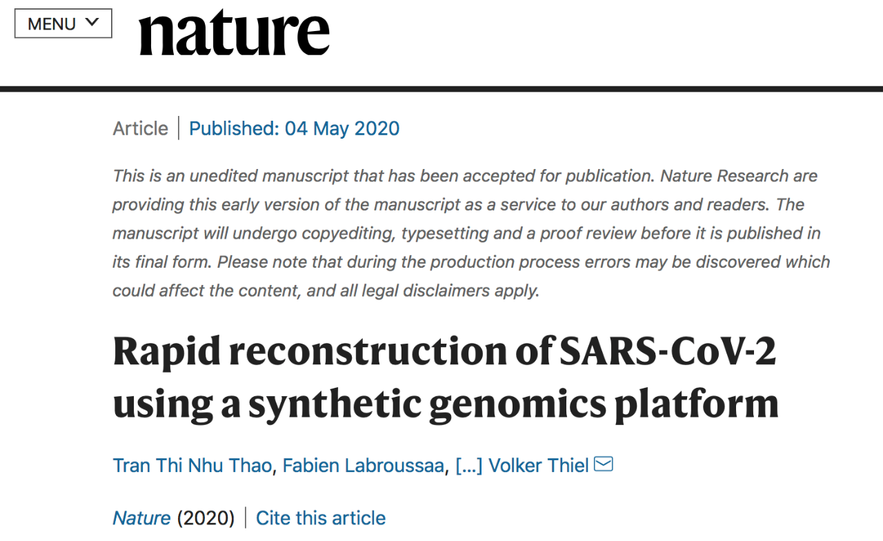 2020年5月4日,瑞士伯尔尼大学Jorerg Jores和Volker Thiel团队在Nature上提前在线发表了题为“Rapidreconstruction of SARS-CoV-2 using a synthetic genomics platform”的研究论文。研究建立了基于酵母的合成生物学方法,为包括冠状病毒在内的RNA病毒建立了一个快速、稳定和通用的反向遗传学平台。该研究此前曾在预印版bioRxiv网站上传。