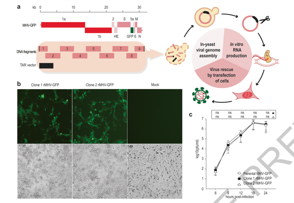 研究人员首先测试了带有绿色荧光蛋白的小鼠肝炎病毒(MHV-GFP),感染细胞后分离得到,随后通过RT-PCR放大多个片段,通过T7-RNA聚合酶和酵母重组系统,成功合成完整的病毒序列,其感染性和复制动力学特性与原病毒相同。随后研究人员MERS-CoV测试该系统对冠状病毒以及改造是否试用,扩增了8个相互重叠的片段并进行改造后重组,结果表明均成功得到了rMERS-CoV和rMERS-CoV-GFP,虽然复制动力学略有降低,但平台仍适用于合成修改冠状病毒基因组。