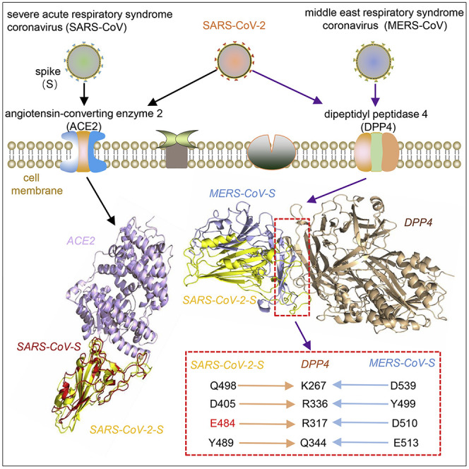 冠状病毒是一类正股RNA病毒,病毒颗粒包膜上的刺突(S)糖蛋白(下称S蛋白)通过它的受体结合域(RBD)介导受体识别,并在S蛋白裂解成S1和S2亚基后进行膜融合。受体是决定冠状病毒的宿主嗜性和致病性的主要因素。冠状病毒已经进化出了复杂的受体识别模式。来自亲缘关系较近的冠状病毒的S蛋白可以识别不同的受体,而来自亲缘关系较远的S蛋白可以采用相同的进入受体。比如,SARS-CoV以血管紧张素转换酶2(ACE2)为主要进入受体,MERS-CoV则以跨膜二肽基肽酶4(DPP4,又称为CD26)为主要进入受体。一些报道已提出SARS-CoV-2利用SARS-CoV受体ACE2进入宿主细胞,尽管与SARS-CoV相比,SARS-CoV-2 S蛋白的RBD内5个关键残基中的4个发生了突变。另一种人类冠状病毒NL63也使用ACE2作为它的受体,然而冠状病毒NL63属于α冠状病毒属。此外,根据对病毒基因组特征的分析结果,有人认为SARS-CoV-2的自然宿主是蝙蝠和穿山甲,但还没有证据表明有一种直接将SARS-CoV-2传播给人类的中间动物。