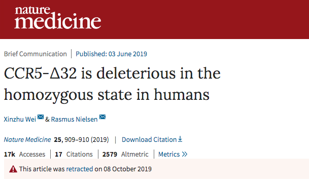 随后,哈佛医学院遗传学家大卫·赖希(David Reich)及其团队发现尼尔森和魏新竹的方法低估了英国生物样本库中携带两个CCR5-Δ32突变的人数。具体来说,论文作者识别具有CCR5-Δ32突变的个体的方式有误。[2]