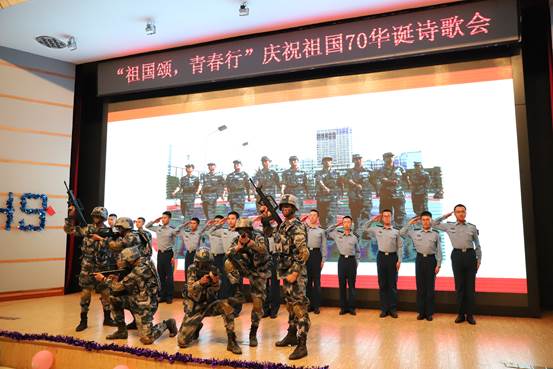 9月29日晚,基础医学院学员二大队团委在科学大会堂举办了以“祖国颂,青春行”为主题的诗歌会。大队全体学员以朗诵、合唱、舞蹈、乐器演奏等多种形式表达了当代军校大学生为祖国母亲七十周年华诞献礼的赤子之心。