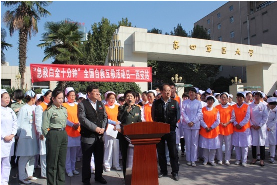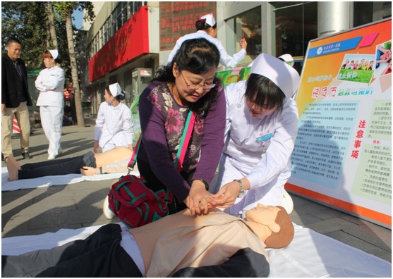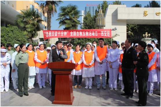 10月10日10点10分,我校护理系牵头,协同西安市14家医院,在学校正门外广场开展2015第六届 “急救白金十分钟•全国自救互救日”活动。西安市学会管理办主任、西安医学会副会长兼秘书长葛移繁,西安市学会管理办副主任彭慧,护理系杨枫副主任,西安市急救护理专业委员会主任委员刘喜文教授及西安市急救护理专业委员会成员等100余人参加。刘喜文主任委员主持活动。陕西省西安站作为新成员首次参与此次活动。今年活动主题是“掌握心肺复苏技术”。开幕式上,葛主任对自救互救的重要性进行了阐述,并对西安市急救护理专业委员会的精心筹备和现场实施给予高度评价。刘主任对急救白金十分钟的起源、发展、现状及趋势进行了详细介绍与解析。之后,开展“急救白金十分钟•全国自救互救日”活动。由14家医院的急诊科医务人员现场为大众示范并指导心肺复苏技术,发放急救健康教育材料及现场咨询活动。活动持续3个小时。此次活动,增强了大众的急救意识,提升了意外伤病的早期自救互救知识和技能,对有效预防意外伤病的死亡率,减少伤残率奠定了基础。“急救白金十分钟•全国自救互救日”是由“白金十分钟全国自救互救志愿服务联盟”发起,活动口号是“把握白金十分钟,创造生命奇迹”,目的宗旨是向大众宣传普及急救知识和技能,降低意外伤病死亡率、减少致残率。活动形式是每年10月10号10点10分开展全国性活动。目前已成功举行了五届,直接影响40万人。今年是第六个“急救白金十分钟•全国自救互救日”,活动范围涉及全国31个省154个城市和站点500余家单位。护理系作为西安市急救护理专业委员会主委单位,负责活动的组织、开展和实施。