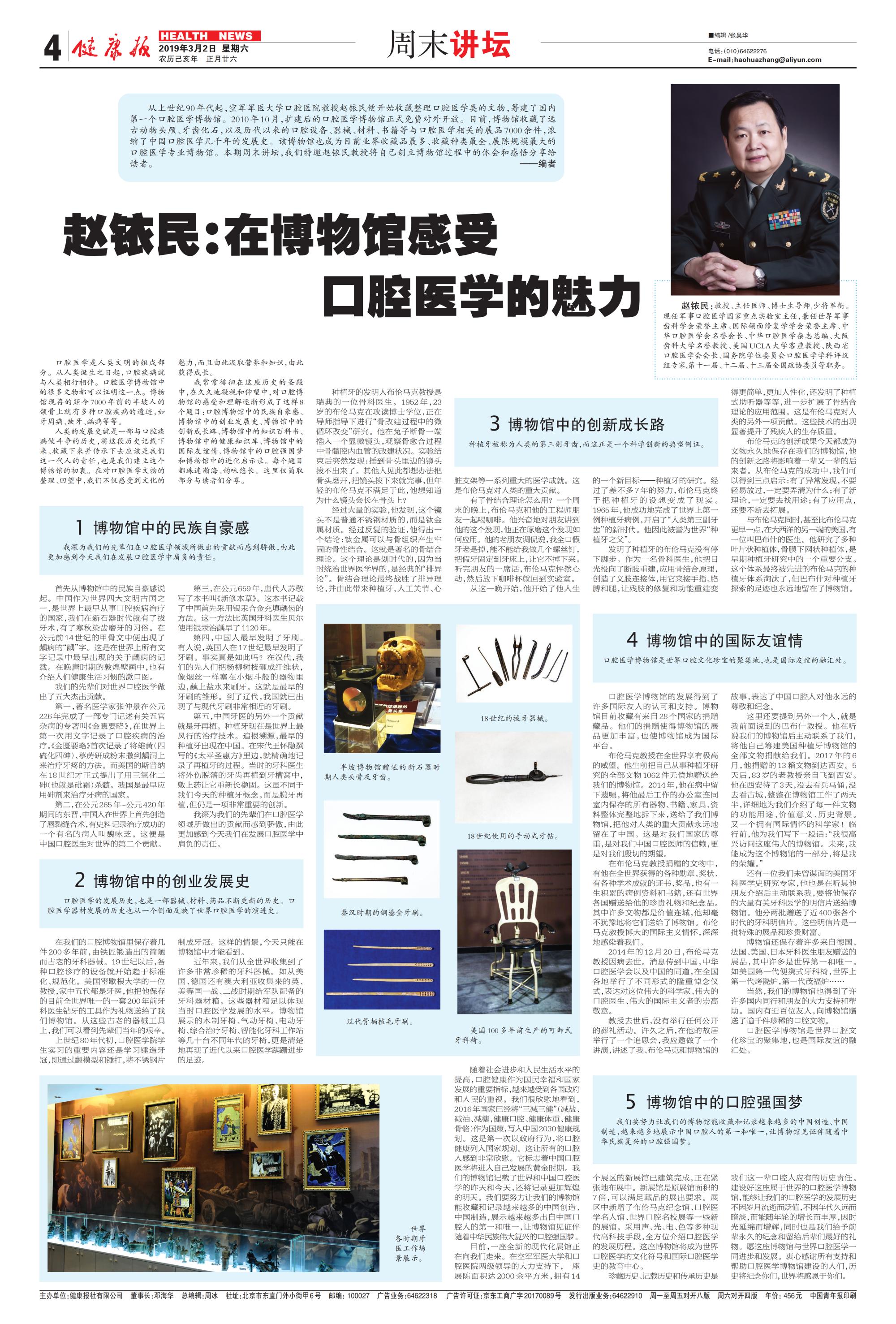 从上世纪90年代起,空军军医大学口腔医院教授赵铱民便开始收藏整理口腔医学类的文物,筹建了国内第一个口腔医学博物馆。2010年10月,扩建后的口腔医学博物馆正式免费对外开放。目前,博物馆收藏了远古动物头颅、牙齿化石,以及历代以来的口腔设备、器械、材料、书籍等与口腔医学相关的展品7000余件,浓缩了中国口腔医学几千年的发展史。该博物馆也成为目前业界收藏品最多、收藏种类最全、展陈规模最大的口腔医学专业博物馆。本期周末讲坛,我们特邀赵铱民教授将自己创立博物馆过程中的体会和感悟分享给读者。——编者
