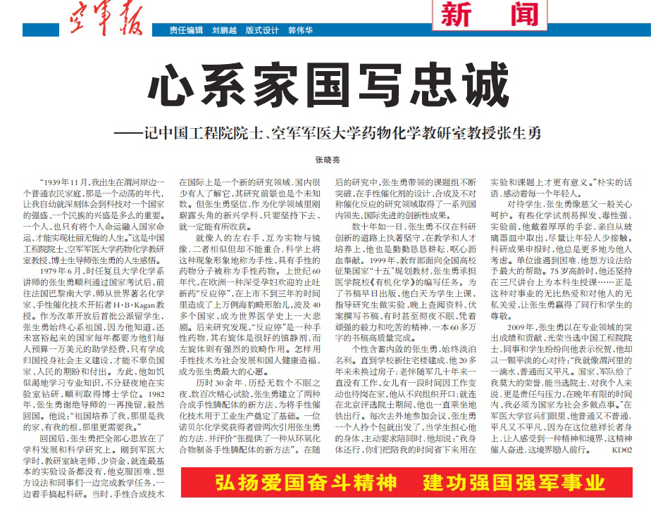 “1939年11月,我出生在渭河岸边一个普通农民家庭,那是一个动荡的年代,让我自幼就深刻体会到科技对一个国家的强盛、一个民族的兴盛是多么的重要。一个人,也只有将个人命运融入国家命运,才能实现壮丽无悔的人生。”这是中国工程院院士、空军军医大学药物化学教研室教授、博士生导师张生勇的人生感悟。