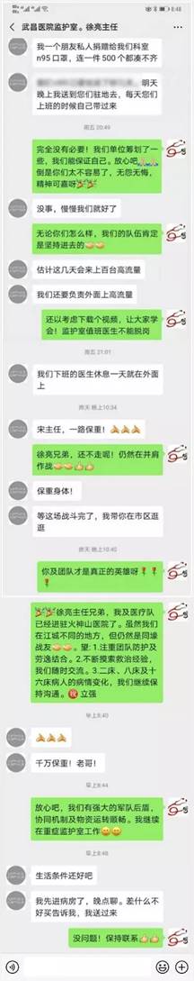 2月初,联勤保障部队所属医院抽组950人,先期抵达的陆军军医大学、海军军医大学、空军军医大学三支医疗队450人纳入统一编组,承担起武汉火神山新型冠状病毒感染肺炎专科医院医疗救治任务。“徐亮兄弟,我及医疗队已经进驻火神山医院了。”一到驻地,宋立强向徐亮发了信息。身在两地,心在一起。宋立强依然关心着武昌医院的患者病情,徐亮依然记挂着宋立强团队的生活、安危。他们是战友,互相支持、互相关心。他们是英雄,惺惺相惜、忘我付出。彼此间,没有豪言壮语,只是殷殷叮嘱和细细关怀。