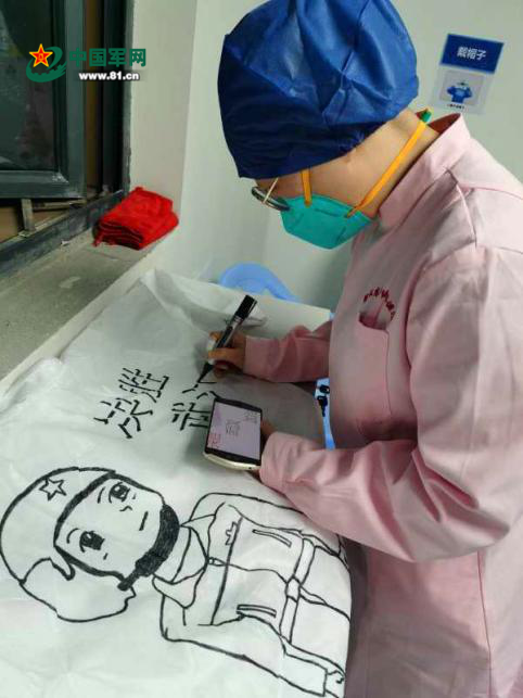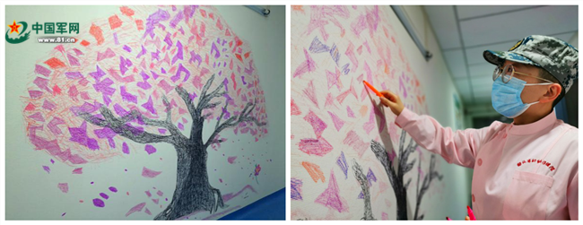 虽然每一幅作品的创作时间不到十分钟,陪伴我们的时间也不过数个小时,但祝捷依然倾注了才思与心血。我问她,“占用自己的休息时间完成这些不会留存的画,值得吗?”她毫不犹豫地点了点头,“哪怕我的画只能让战友和病人有1分钟的快乐和开心,那就已经帮助他们纾解了60秒的压力和焦虑!这难道不值得吗?当然值得!肯定值得!”