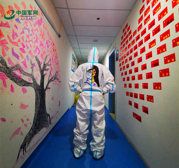 这幅樱树壁画的作者就是感染二科的护士祝捷。她是一名文职人员,之前在单位长期从事感染控制工作,当感染二科被调整为全院的重症医学科时,她便以感控骨干的身份被抽调加强工作。令祝捷感到高兴的是,在完成本职工作之外,自己兴之所至的随手涂鸦给战友们带去满心的温暖与治愈。今天,让我们一起步入这个特殊的画廊,欣赏祝捷为战友们绘制在身上的画。