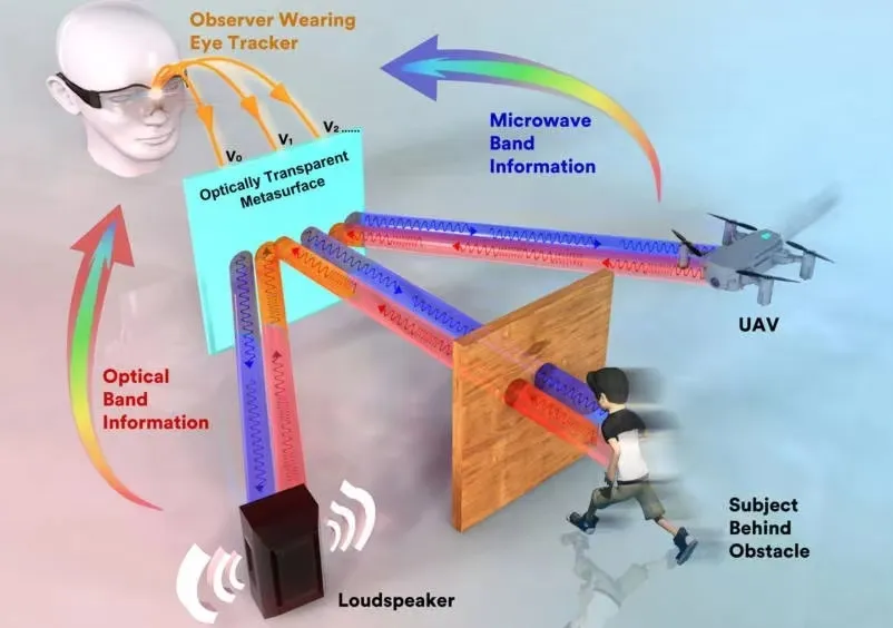 “看哪儿探哪儿” 面对灾后复杂的地形地貌,设备的轻量化、智能化成为团队新的研究方向。电影《钢铁侠》中,主角佩戴的神奇眼镜引起了大家的兴趣。“戴上它,对手的信息一览无遗。”王健琪说,“增强人的视觉感知能力,成为大家重点思考的问题。” 那就打造一款“透视眼镜”!团队大胆设想。 “我们的方案是通过眼动信息来控制雷达波束,眼睛看到哪,生物雷达发射的电磁波就指向哪,从而实现‘看哪儿探哪儿’。”团队成员安强介绍,“之后,再将探测信息显示在人的眼前。” 眼动信息的追踪此前已有成熟方案,灵活调控和定向发射电磁波成为系统实现的关键。安强说:“大家想到了超材料,它能实现对电磁波偏振、相位、传播模式等特性的调控。” “我们反复设计迭代超材料,并将其打造成可光学透视的超表面,覆盖在生物雷达外表层。”团队成员邱天硕解释,“当生物雷达发射电磁波经过超表面时,超表面可根据眼动信息,灵活调控电磁波的指向。”