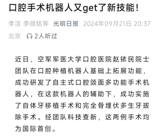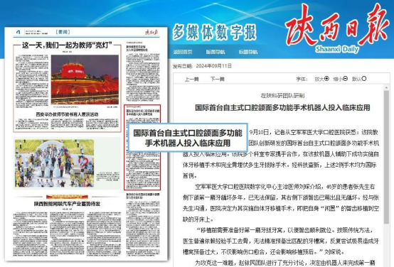 近日,大学口腔医院赵铱民院士团队创新研发的国际首台自主式口腔颌面多功能手术机器人投入临床应用。口腔医院多科室专家携手合作,在这款机器人辅助下成功实施自体牙移植手术和完全骨埋伏多生牙拔除手术。2例手术均为国际首例,先后被人民日报、光明日报、陕西日报、陕西卫视等多家媒体平台关注报道。