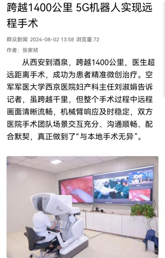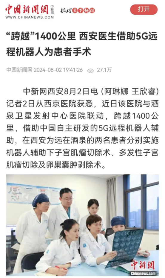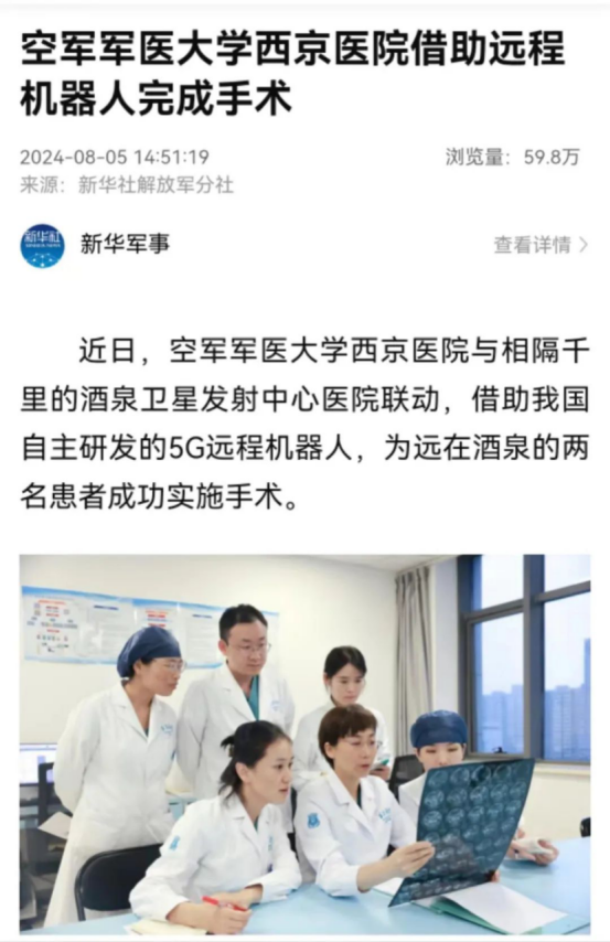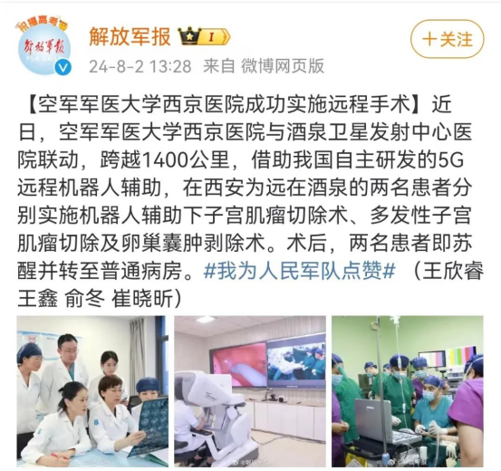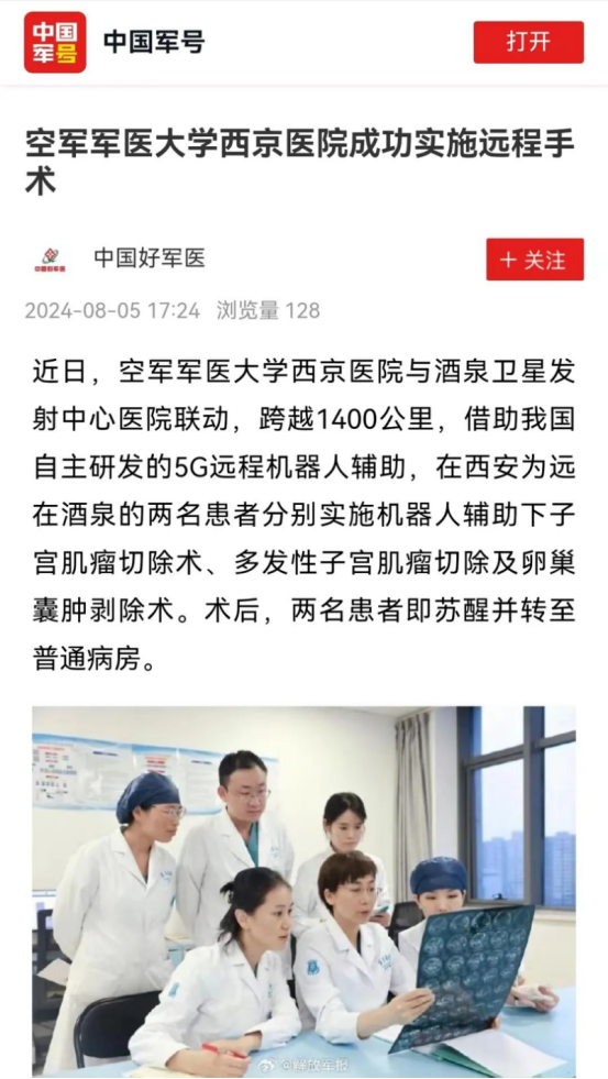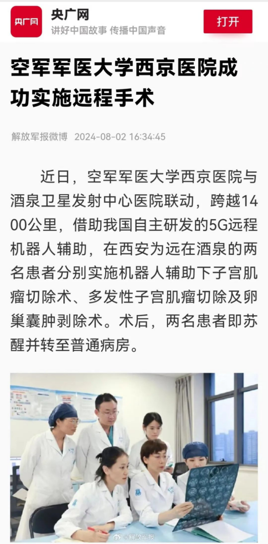 近日,大学西京医院与酒泉卫星发射中心医院联动,跨越1400公里,借助中国自主研发的5G远程机器人辅助,在西安为远在酒泉的两名患者分别实施机器人辅助下子宫肌瘤切除术、多发性子宫肌瘤切除及卵巢囊肿剥除术,新华社、央视军事报道、央广网、中国新闻网、解放军报微博等多家媒体平台关注报道。