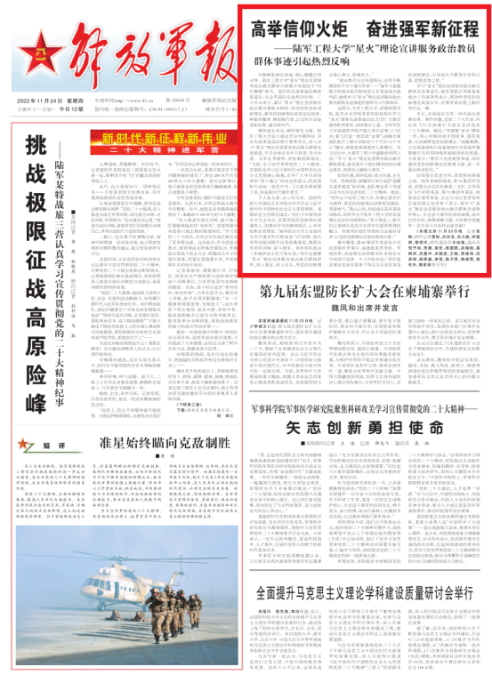 冬日,北部战区空军一场实战化演练结束。稍作休整,党的二十大代表、歼击机飞行员高溥宇为战友宣讲党的二十大精神。她说:“我要像‘星火’群体一样,用心用情讲述中国故事、强军故事,生动阐释党的创新理论。”战舰驰骋,正在某海域执行战备值班任务的海军铜陵舰官兵利用网络终端阅读相关报道,大家表示:“要学习先进典型事迹,深切感悟党的创新理论的真理力量,进一步强化使命担当。”