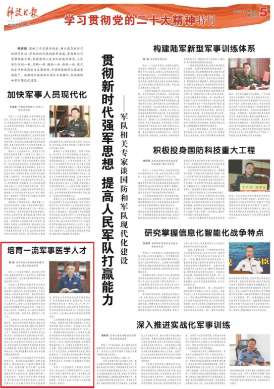 党的二十大报告指出,人民军队始终是党和人民完全可以信赖的英雄军队,这为当代军人吹响了强军号角、赋予了肩头重任,我们将继续努力,培育一流军事医学人才,以实现建军一百年奋斗目标,加快把人民军队建成世界一流军队。