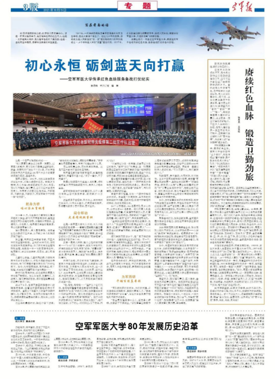 在党中央的深切关怀下,在中央军委和空军党委的坚强领导下,空军军医大学走过了80载砥砺奋进的岁月。自抗战烽火中孕育而生,白手起家创立战地医院,在人民军队革命化、现代化、正规化建设洪流中快速发展,自力更生创造出90多项国内外“首例”“首创”“第一”“唯一”,再到改革强军大潮中听令景从,站上新起点,军医大学官兵始终初心如炬,在融入建设世界一流空军的伟大征程中,正朝着打造立德树人的“百年品牌”、为战育人的“金字招牌”阔步前行。