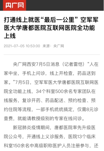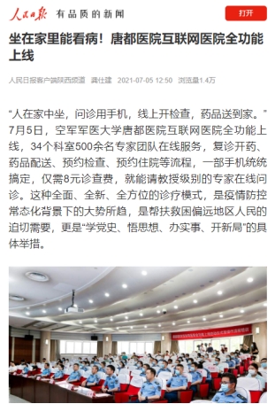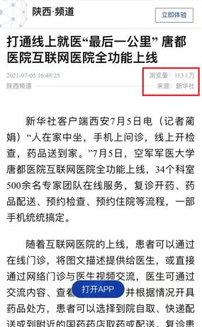专业统计分析,截至目前,唐都医院互联网医院全功能上线新闻,共有73家中央、省市媒体报道转载,其中新华社阅读量高达113.1万次、人民日报客户端陕西频道阅读量1.4万次、华商报微信公众号点击量3.2万次、微博话题阅读量3.5万次。媒体广泛认可,网民高度关注,网民阅读总量上千万次,极大提升了医院知名度和影响力。