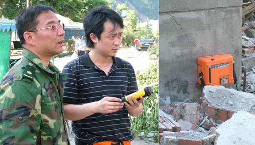 发生地震后仅1个小时,在得知震中在四川汶川县后,系领导和课题组一致认为,考验我们的时候到了,时间就是生命,我们研制“生命探测雷达”可以为搜救受灾人民的生命做出贡献,应立即想办法奔赴救灾第一线。课题组马上与合作单位必肯科技公司联系,希望得到他们的支持,必肯科技公司积极与国家和陕西省有关单位联系,获知陕西省将组织首批抗震救援队奔赴灾区。于是,我系派出了主动请缨的荆西京高级实验师、