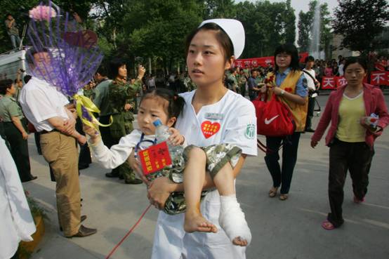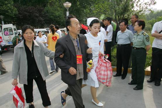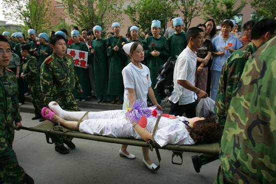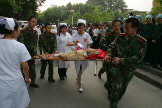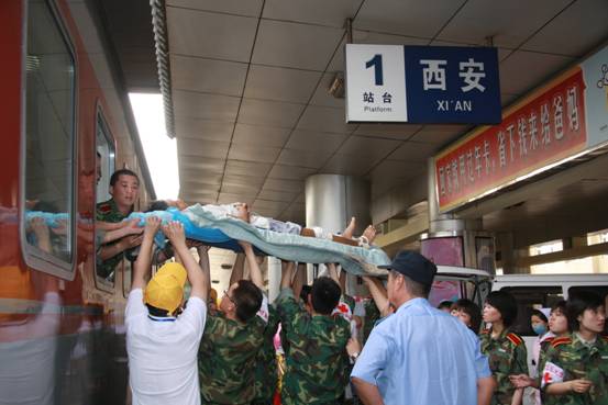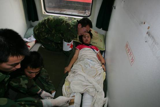 得知首批重伤员要后送的消息后,我校积极主动向陕西省卫生和计划生育委员会协调,要求承担首批重伤员的救治任务,并于20日从正在救灾前线执行救援任务的7支医疗队中抽调了30名医护人员随车护送。在列车运送途中上,医护人员对伤员的伤情进行了检查和分类,并针对不同情况进行处置和护理。