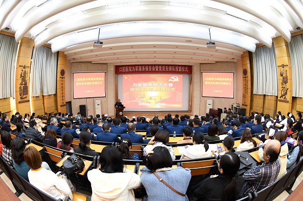 11月9日下午,口腔医院利用党团活动时间,在阶梯教室组织召开为军服务报告会暨党员先锋队授旗仪式。院党委常委、机关各处、各科室党员干部等300余人参会,会议由政治工作处任晓磊主任主持。