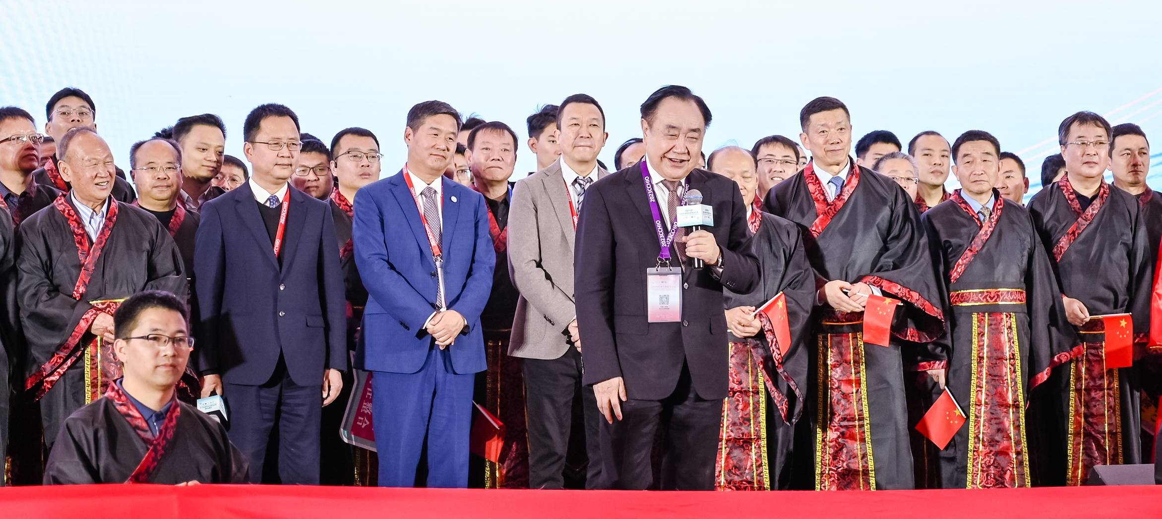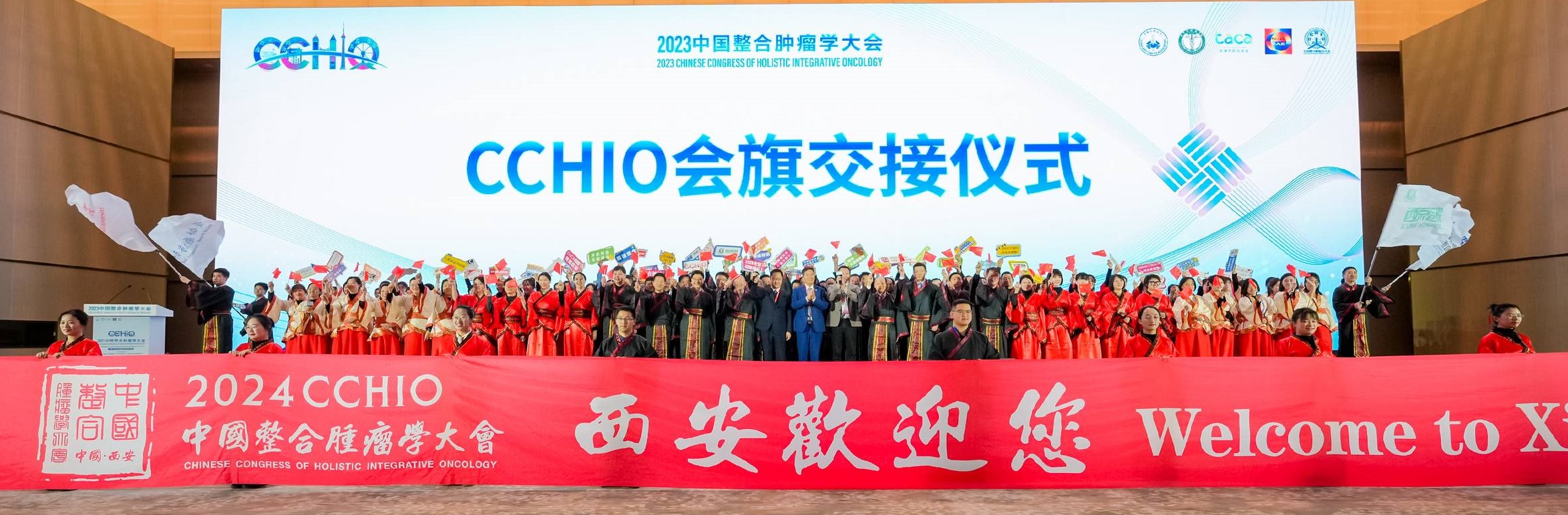 西京医院党小荣院长、聂勇战教授和陕西省抗癌协会宋张骏理事长从大会主席、中国抗癌协会理事长樊代明院士手中接过CCHIO大会旗帜。这一刻开始,CCHIO大会正式进入“西安时间”。接旗仪式上,来自西安的参会代表着汉服组队举旗为2024CCHIO落户西安加油助威。