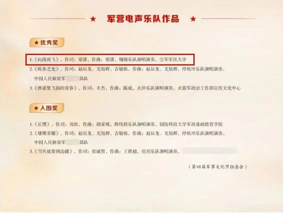 近日,第四届军事文化艺术节获奖名单揭晓,研究生院“翱翔乐队”的原创作品从全军众多优秀队伍中脱颖而出,斩获“军营电声乐队作品优秀奖”,全军仅3首作品获此殊荣!