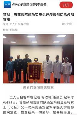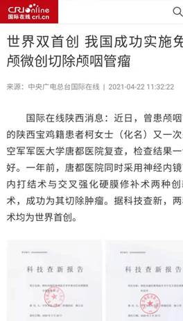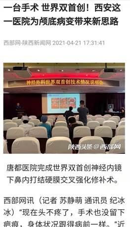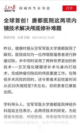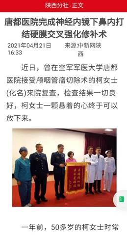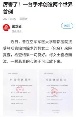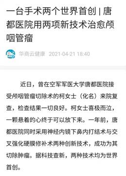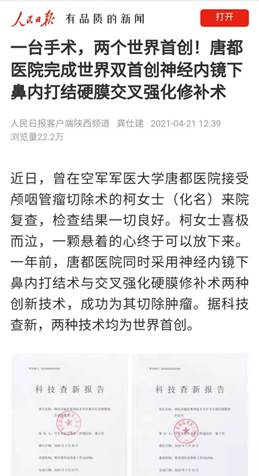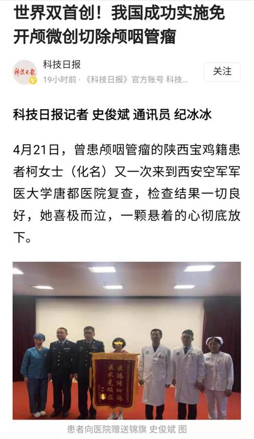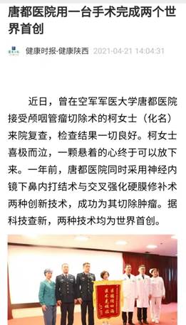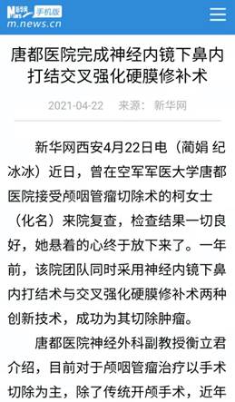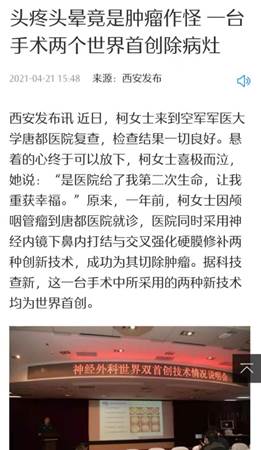 近日,曾在空军军医大学唐都医院接受颅咽管瘤切除术的柯女士(化名)来院复查,检查结果一切良好。柯女士喜极而泣,一颗悬着的心终于可以放下来。一年前,唐都医院同时采用神经内镜下鼻内打结术与交叉强化硬膜修补术两种创新技术,成功为其切除肿瘤。据科技查新,两种技术均为世界首创。