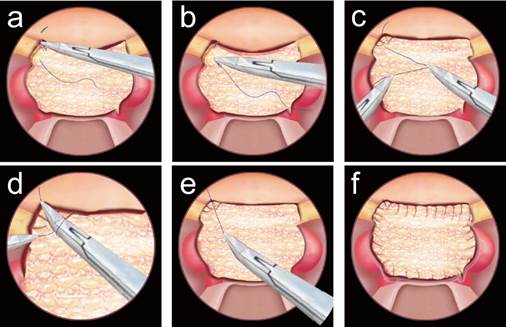 神经内镜经鼻颅底手术中鼻内打结硬膜缝合重建技术示意图