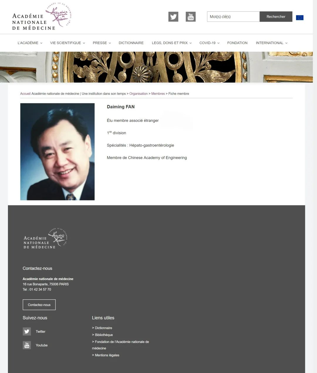 近日,法国医学科学院来信,我校樊代明教授当选法国医学科学院外籍院士,其专业为肝病学和胃肠病学。这是继2013年当选美国医学科学院外籍院士后,樊院士获得的又一项国际殊荣,必将在我校与国际同行的交流合作中发挥重要作用。