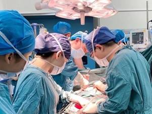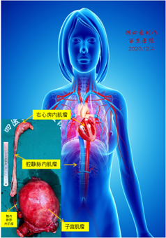 12月4日,手术当日,妇产科陈必良教授、马佳佳医生开腹,游离出巨大的子宫肌瘤及双侧附件,切除后分离出瘤体远端,游离下腔静脉。心血管外科董小超副教授开胸在心脏不停跳并行体外循环下切开右房,探查右房内瘤体情况,通过腹部切口,将髂静脉切开分离肿瘤,于肿瘤起始部位切断肿瘤,自右心房内取出瘤体。循环稳定,术中食道超声持续观察以确定心内瘤体彻底取出。患者病变子宫极大,瘤体呈圆柱形,长约30-40cm。术后患者转入心血管外科监护室继续监护治疗。术后当天,患者恢复自主呼吸,生命体征平稳,顺利拔管。病情稳定后安返病房,与家人团聚。