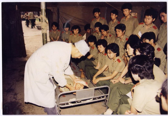 刘凡教员在行军的帐篷里为学员示范查体
