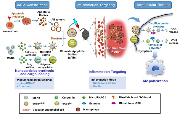 细胞外囊泡(EVs)是细胞分泌的一种微小囊泡,通过转运生物活性分子在组织再生、疾病治疗、免疫调控等多个领域发挥着重要作用。相较于传统药物递送系统,天然EVs具有低免疫原性、良好生物相容性、天然靶向性等显著优势,有望成为新一代药物递送的天然载体。针对临床疾病治疗需求,亟需高特异性药物递送系统实现精准治疗,而工程化构建EVs有望在未来解决这一临床难题。本研究选用免疫细胞来源的囊泡(T细胞来源凋亡小体)结合二氧化硅纳米粒子(MSNs),利用工程化手段构建嵌合型细胞外囊泡,进一步增强其靶向性和目标治疗分子负载能力。同时实现工程化囊泡的模块化构建,达到针对不同治疗分子(小分子药物和核酸)的高效负载和靶点控释,有效实现了炎症的靶向调节。该研究为工程化构建细胞外囊泡的理论和发展奠定了实验基础,同时也为炎症相关疾病和组织再生的精准治疗提供了新思路。