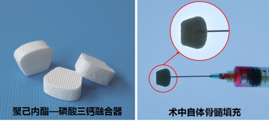 针对目前传统椎间融合器存在的问题,西京医院骨科郭征教授带领团队,在国家重点研发计划资助下展开新型可降解椎间融合器材料和产品研发。聚己内酯(PCL)材料可在体内缓慢降解,最终降解产物为二氧化碳和水,常被用作药物载体或手术缝线等。磷酸三钙(TCP)与人体骨无机成分相近,被广泛用于骨的填充修复,是最常用的植骨材料之一。项目组将聚己内酯和磷酸三钙两种新材料配比混合,不断调整材料工艺,优化产品设计,并通过3D打印的方法制备出新型可降解聚己内酯—磷酸三钙椎间融合器,经过临床前实验证实具有良好的生物安全性、力学支撑性和骨长入等特性。该新型融合器产品的临床试验于近期通过医院科研伦理审核,并在国际临床试验注册权威机构注册发布(注册号:NCT04167878)。
