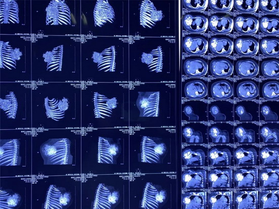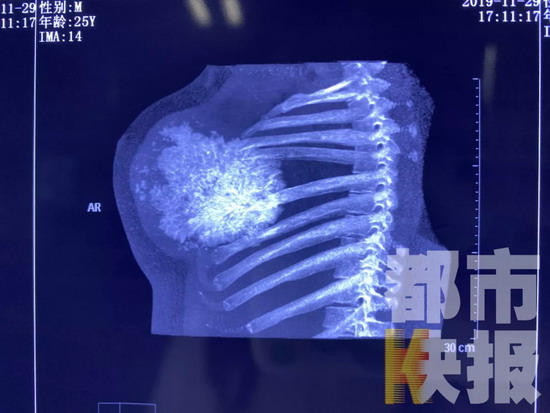 2019年12月9日,小田来到唐都医院就诊,主管医生杨三虎为小田做了CT检查,显示右前胸壁巨大肿瘤,大小是45cm×35cm,鸡蛋大小的包块已经长成篮球大小的肿瘤,穿刺活检诊断为肋软骨源性恶性肿瘤。